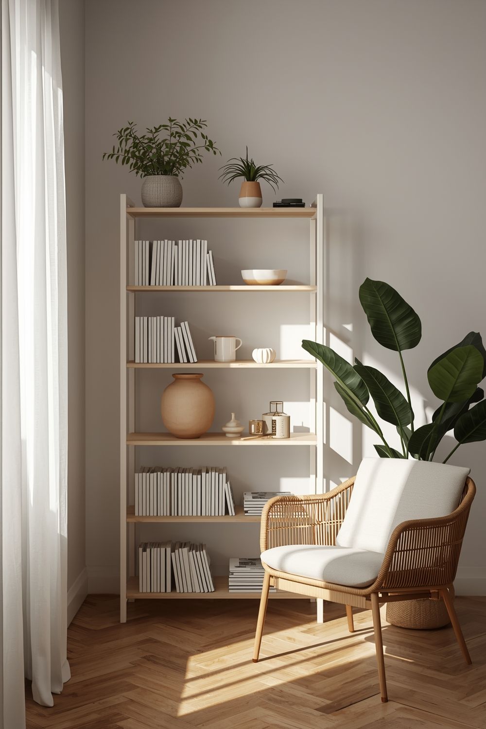 Rak terbuka membantu menata barang sekaligus menjadi elemen dekoratif. Gunakan untuk menyimpan buku, vas kecil, atau dekor sederhana agar ruangan terlihat lebih hidup.