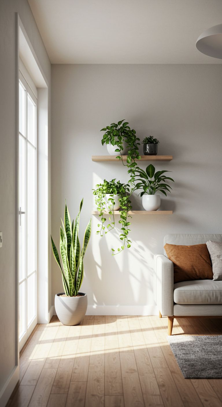 Tanaman hias seperti monstera, snake plant, atau fiddle leaf fig dapat memberikan sentuhan segar sekaligus mempercantik ruangan. Selain aesthetic, tanaman juga membantu meningkatkan kualitas udara di dalam rumah.